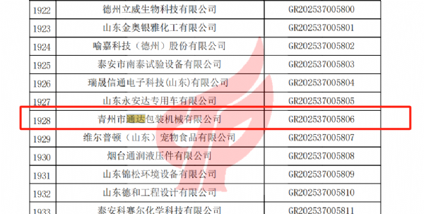 青州市通达包装机械有限公司在入选名单之内,彰显了青州市通达包装机械有限公司在科技成果转化能力、研发组织管理水平及成长性等方面达到国家企业认定标准。